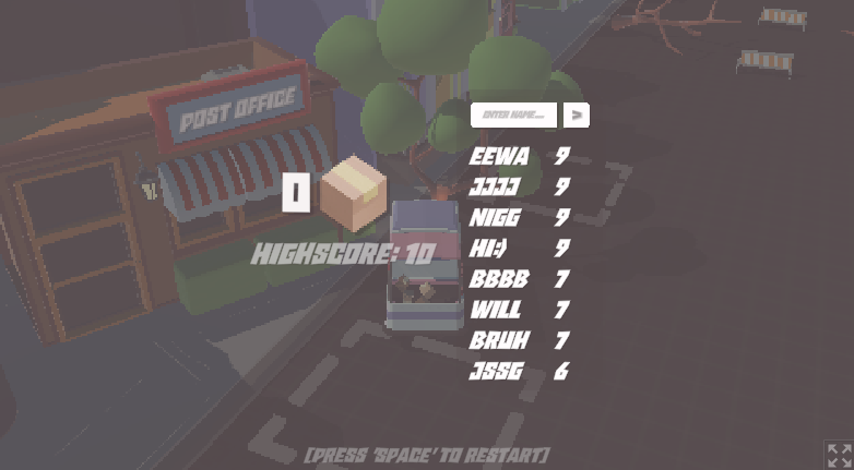 thanks for the feedback, you need to add your name and submit to the leaderboard for it to show up. I can make it automatic though if you think that would work better. Since this was made for a game jam I canāt post any updates on the game till voting is over but Iāve already reworked the entire car controller and I think it feels a lot nicer now, and Iāve changed the hit boxes of quite a few objects to make it easier to drive around. Thanks so much for playing!!